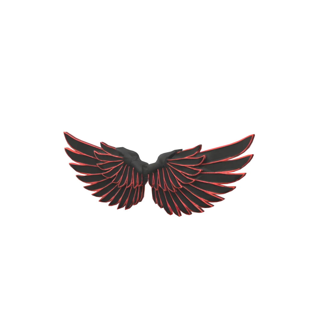 stylized 3D Roblox demon wings wearable, layered black feathers tipped with glowing red edges, sharp angular form with celestial-infernal contrast, dark fantasy aesthetic