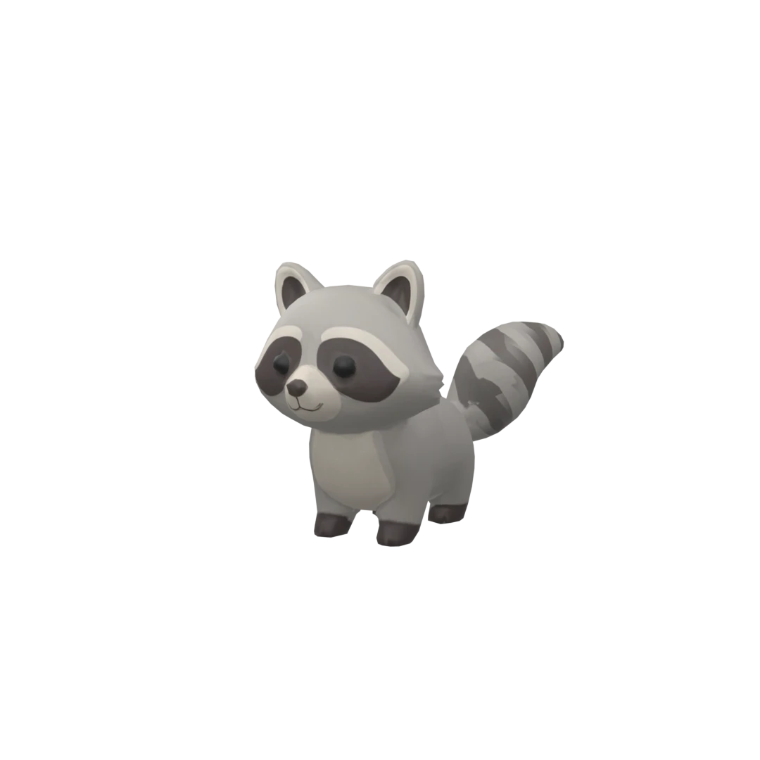 Raccoon Pet Body: Soft, gray or brown with a light-colored belly (beige or cream). Face: Large, black, round eyes with a friendly expression. Mask: Typical raccoon face mask – a dark ring around the eyes, simple and clear. Ears: Small, rounded ears at the top of the head, light on the inside. Tail: Fluffy and slightly curved, with 2–3 distinct dark rings. Legs: Short, with small, round paws.