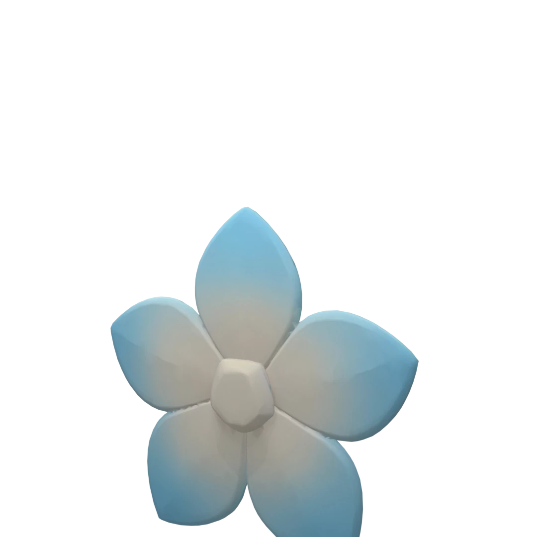 A small five-petaled flower pinned next to the ear placement, its soft white center fading into sky-blue tips with a layered core,