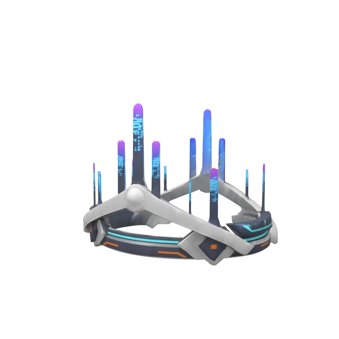 Roblox3D crown with a sleek black and silver design, featuring glowing blue and orange accents along the edges and a central spherical element atop the crown.