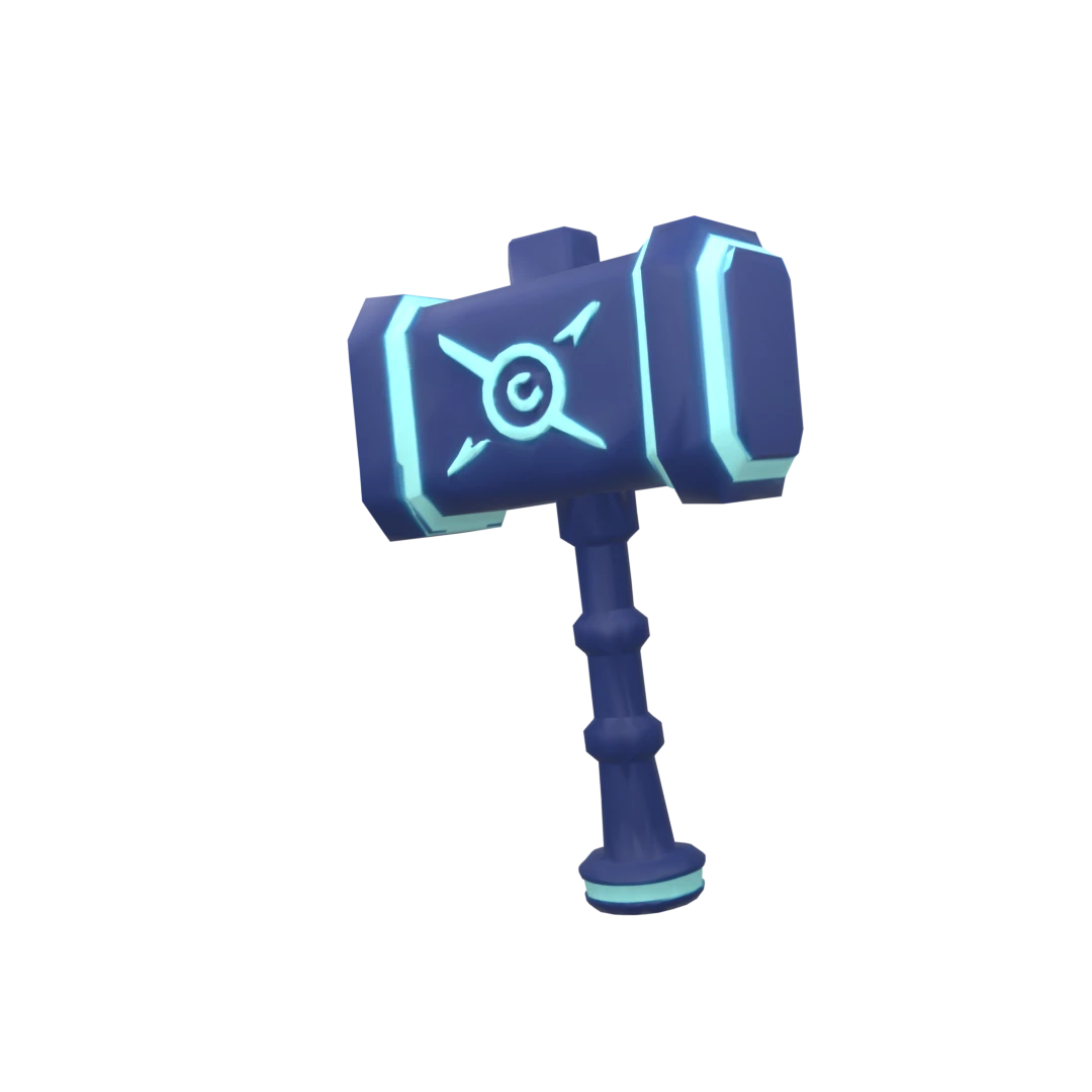 The hammer has a dark blue body with glowing light-blue highlights. A SMITE HAMMER The head is rectangular and features hexagonal accents or gems on the sides, glowing with a cyan hue. The face of the hammer has a spiral or rune-like symbol, suggesting it might have magical or elemental power, possibly ice or energy-based. The handle is dark with a segmented design and ends with a glowing blue cap. Overall, it looks like a fantasy or sci-fi weapon, possibly used by a character with ice, magic