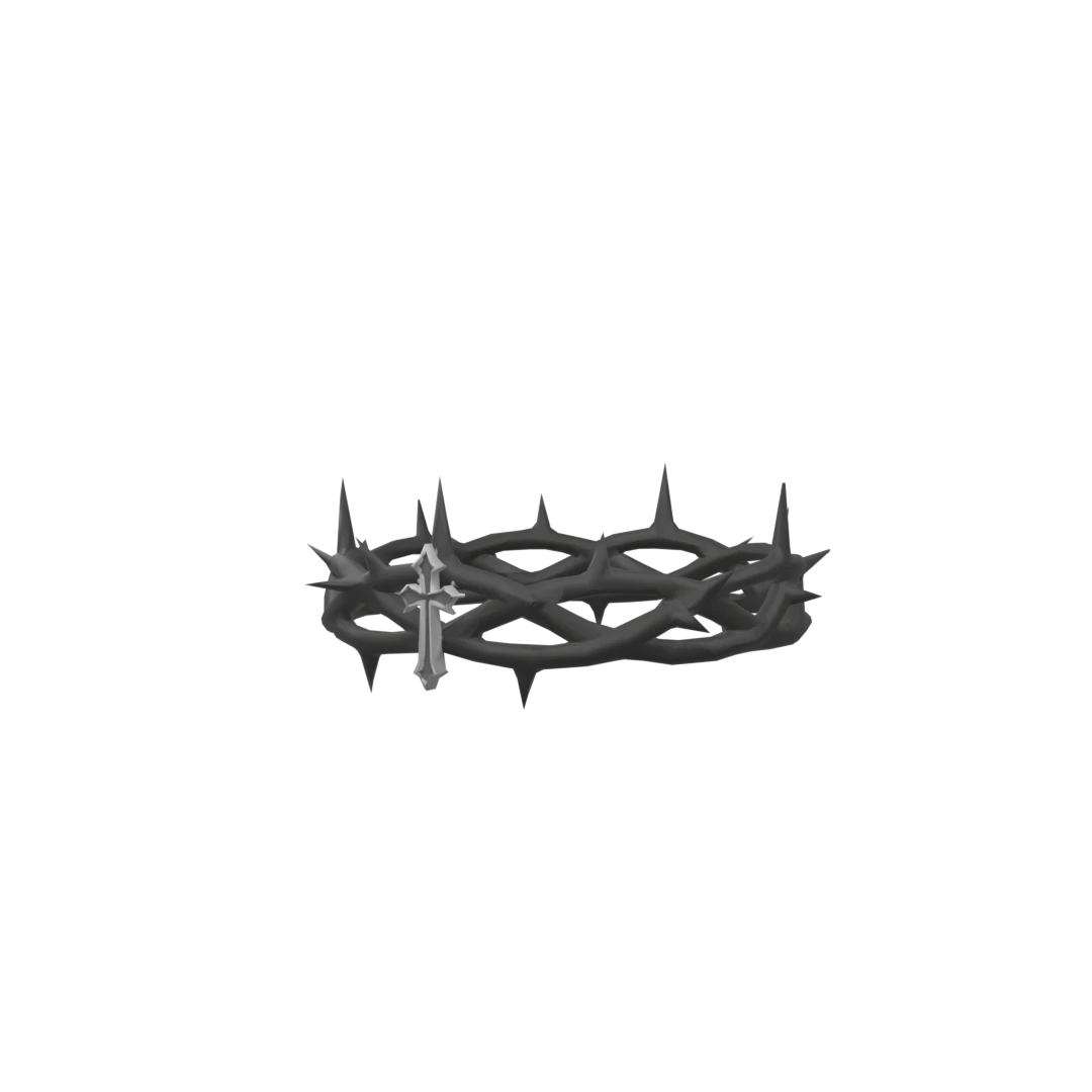 Roblox3D crown made of twisted dark gray thorns, featuring sharp spikes and a subtle silver cross at the forefront, conveying a somber and gothic aesthetic.