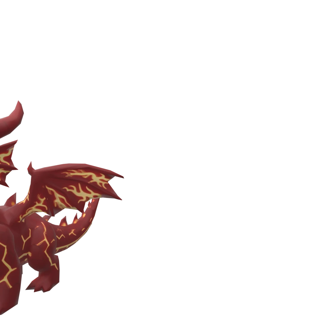 Details: Bright red horns, arrow-shaped tail, glowing red eyes. Magma chain around the neck.