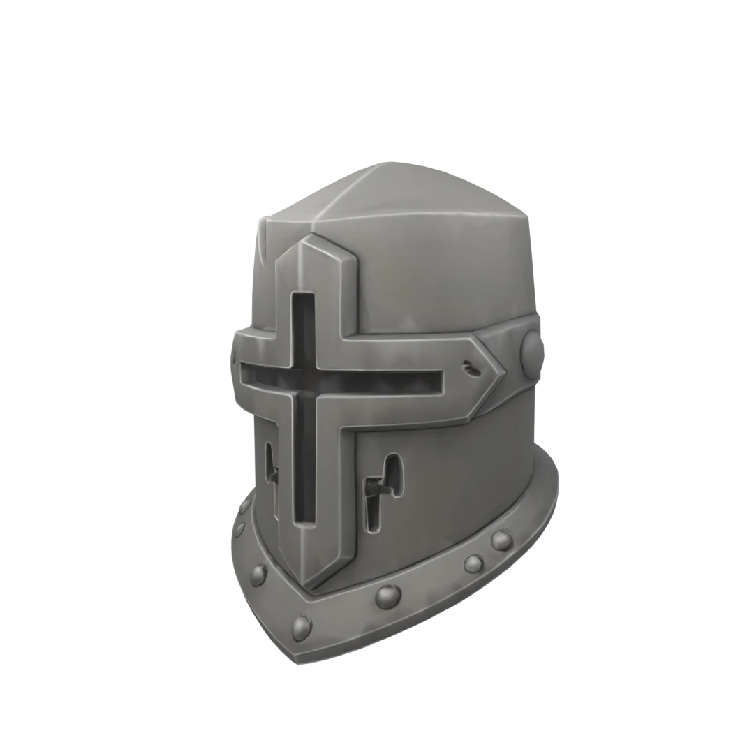 Roblox3D helmet featuring a metallic gray color with a bold cross design on the front and decorative rivets along the base.