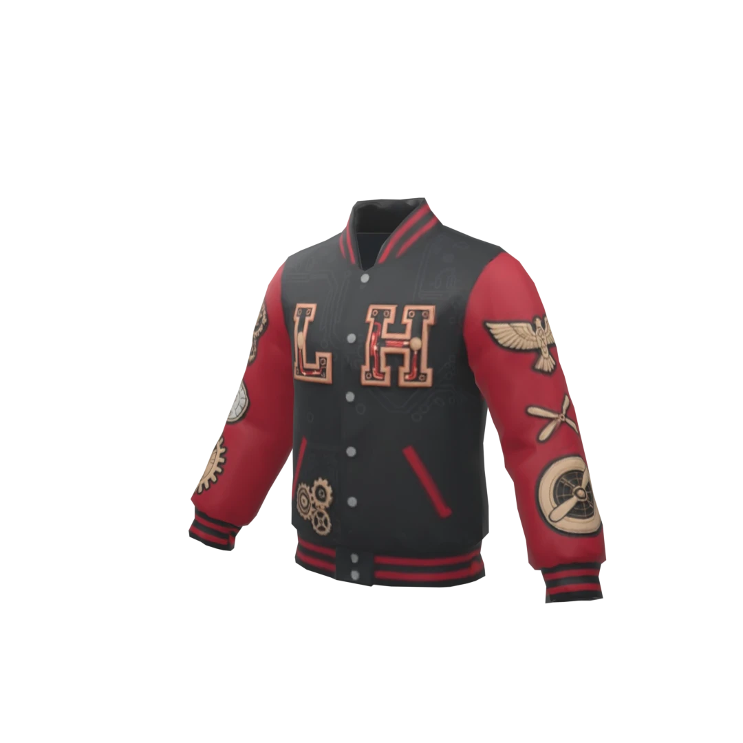 Varsity Jacket negra y rojo, en la parte de enfrente letras "LH" con parches
