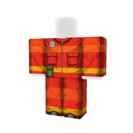 Roblox utility suit featuring a bright orange and red striped design with reflective yellow bands, accented with two front pockets and a circular badge on the chest.