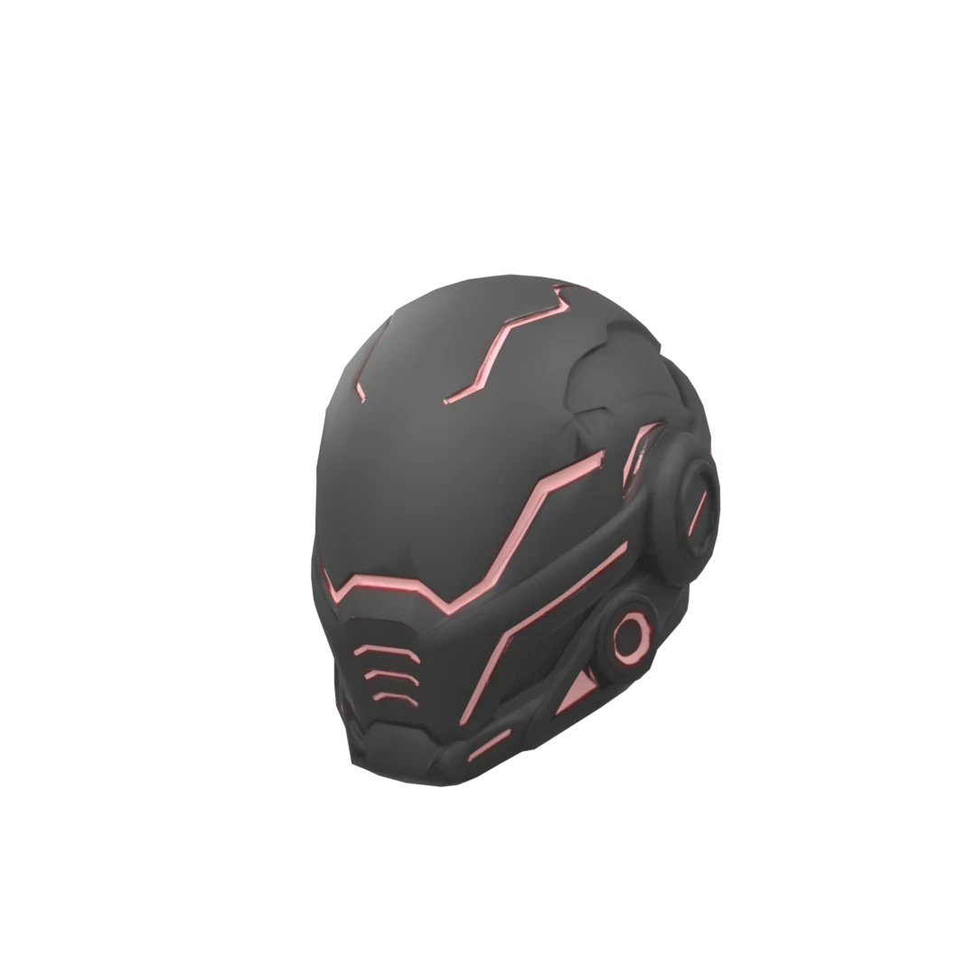 Create a futuristic high-tech Roblox helmet accessory themed in black and glowing red accents. The helmet should have a smooth, armored outer shell with sharp geometric paneling and glowing red circuit-like lines across the front where the visor would be. Make the red lines angular, symmetrical, and aggressive—no soft shape. Add more red glowing streaks and segmented energy lines to give a complex cybernetic look. The style should look sleek, tactical, and advanced, like a cyber assassin helmet Maintain a dark matte black base with bold neon red illumination and clean, sharp edges.