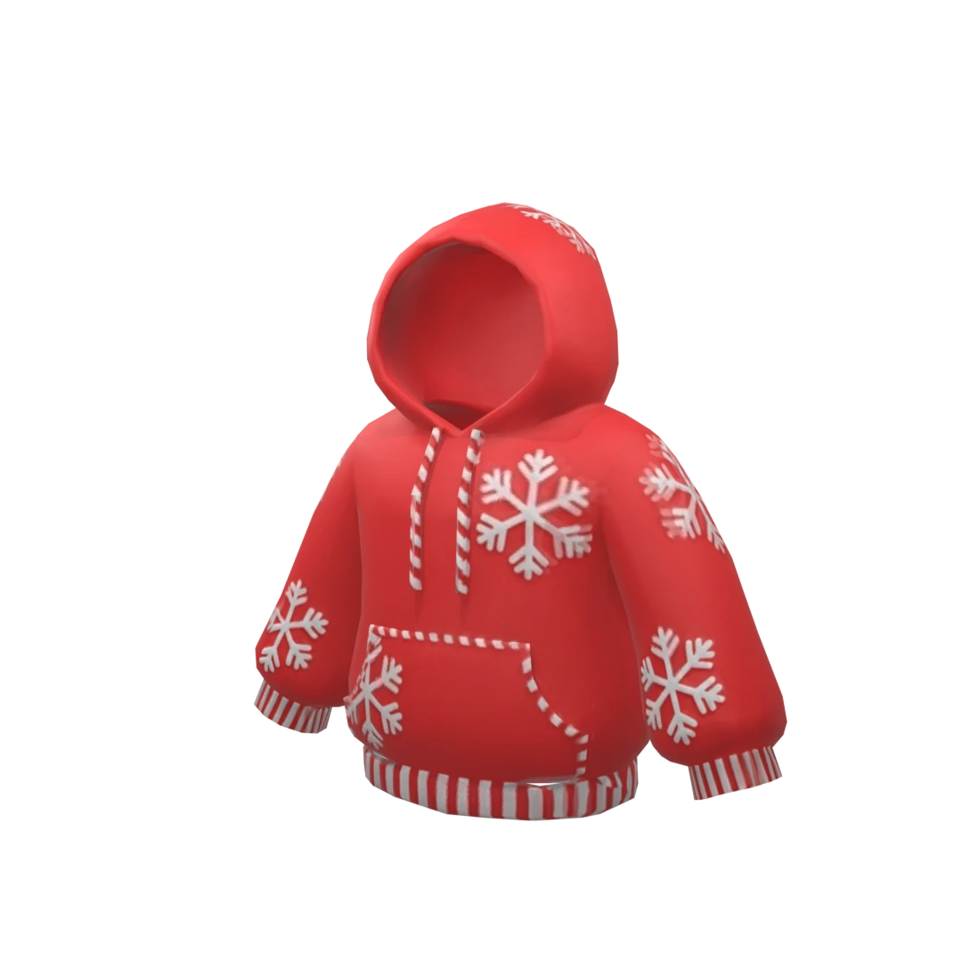 Create a stylish Roblox layered clothing outfit inspired by Christmas 2025 streetwear fashion. The outfit should feature a cozy red hoodie or sweater with subtle white snowflake patterns, candy-cane accents on the sleeves, and a small embroidered spider logo on the chest to represent the creator’s signature (inspired by a heroic theme, but not copyrighted). Include a white fur-lined hood and faint glowing trim for a festive look. The pants should be black or deep red joggers with thin white stri