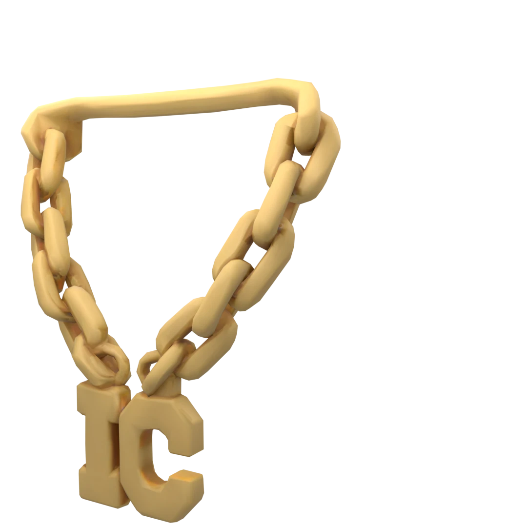 A gold chain necklace with the letters IC on the front