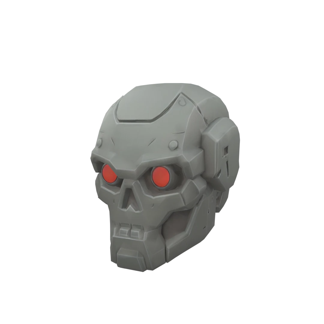Mecha combat helmet with robotic skull design, orange scanner eyes, mechanical jaw, tri-tone helmet
