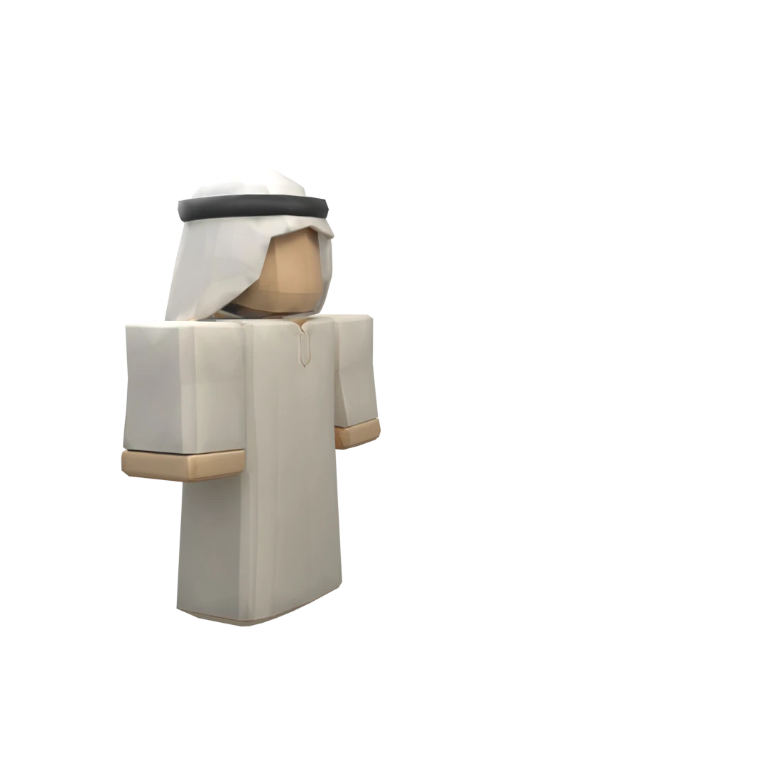 Roblox character model featuring a light blue shirt with a blocky texture, brown arms, purple pants, and a white head.