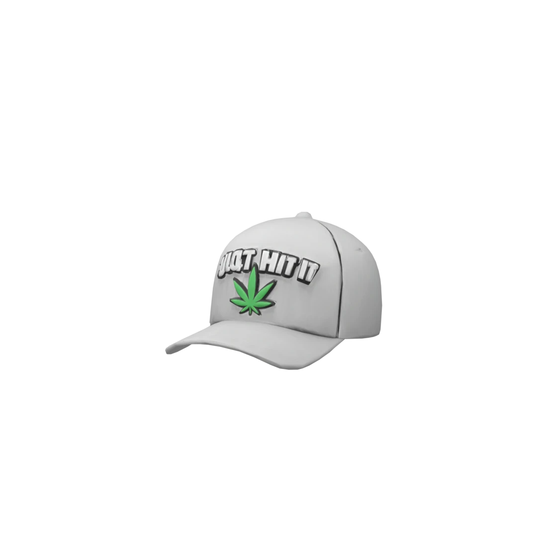 Create a Roblox 3d accessory baseball cap with front text "just Hit It" and marijuana leaf