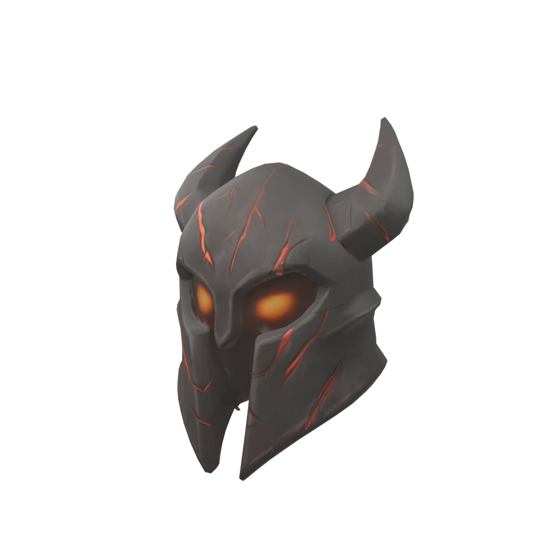 A full-head horror helmet with massive glowing void eyes that drip black mist. The helmet is smooth, cracked matte black with deep scorch marks and glowing purple veins. A wide, twisted grin of jagged teeth stretches across the front like it was carved by something not human. Four cursed objects float around the helmet: a broken plush jaw, a charred marble, a torn scribbled note, and a glitching screen shard. The style is cartoonish, but deeply unsettling — like a haunted mascot from an abandone