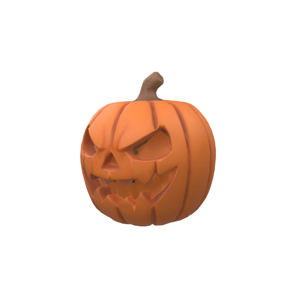 A realistic pumpkin with a menacing grin and and evil eyes carved into it with some detailing on the pumpkin and it being hollow inside