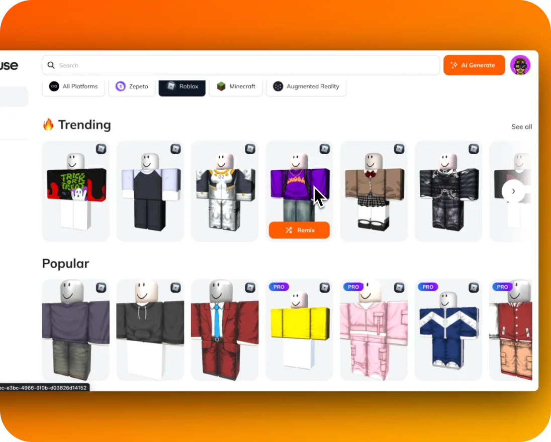 Create awesome Roblox skins for gaming experiences, community connection, or brand identity. Our user-friendly platform simplifies design without any coding. Quickly fashion, test, and release your personalized skins on Roblox. It's suited for players and designers eager to make an impact, encourage more in-game interaction, and forge unforgettable, interactive digital experiences.